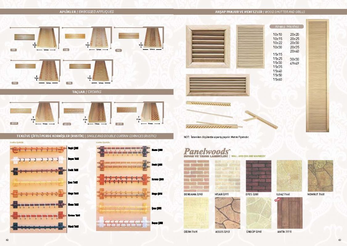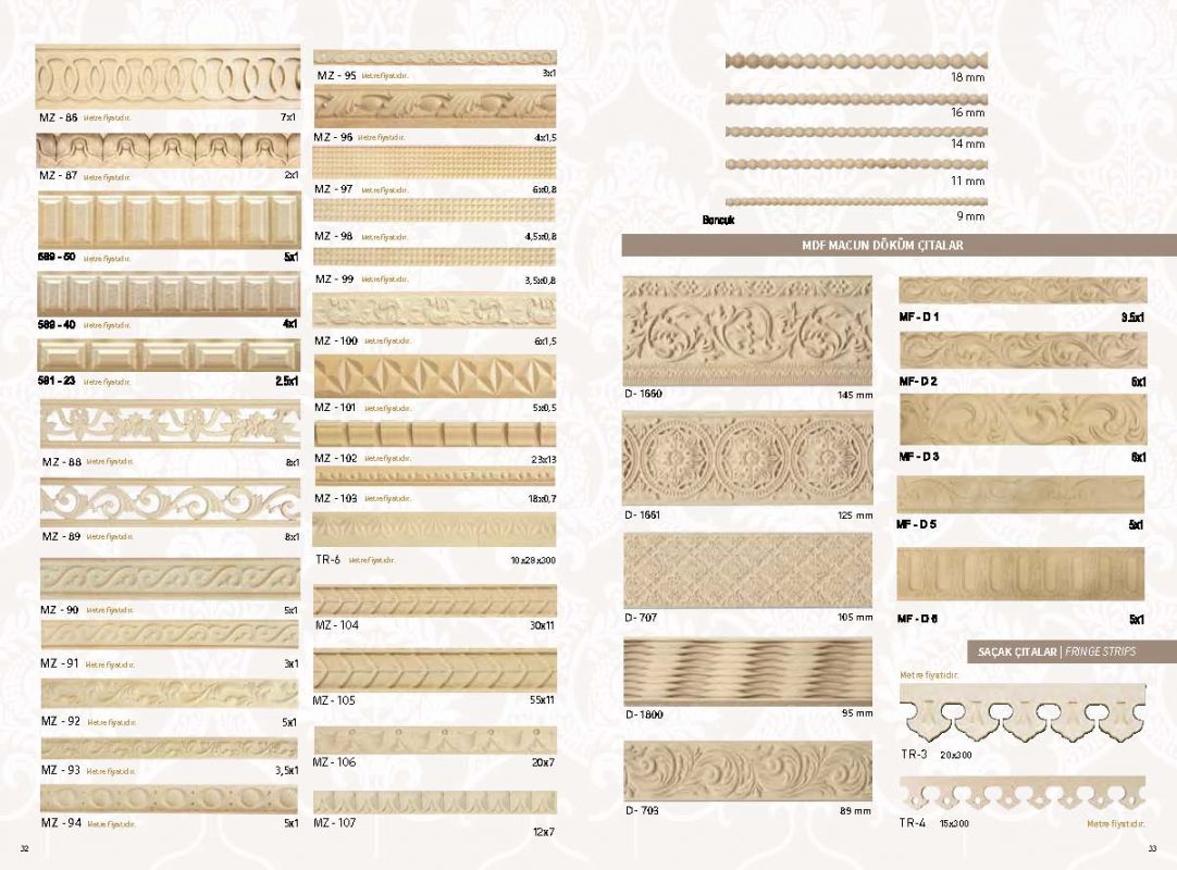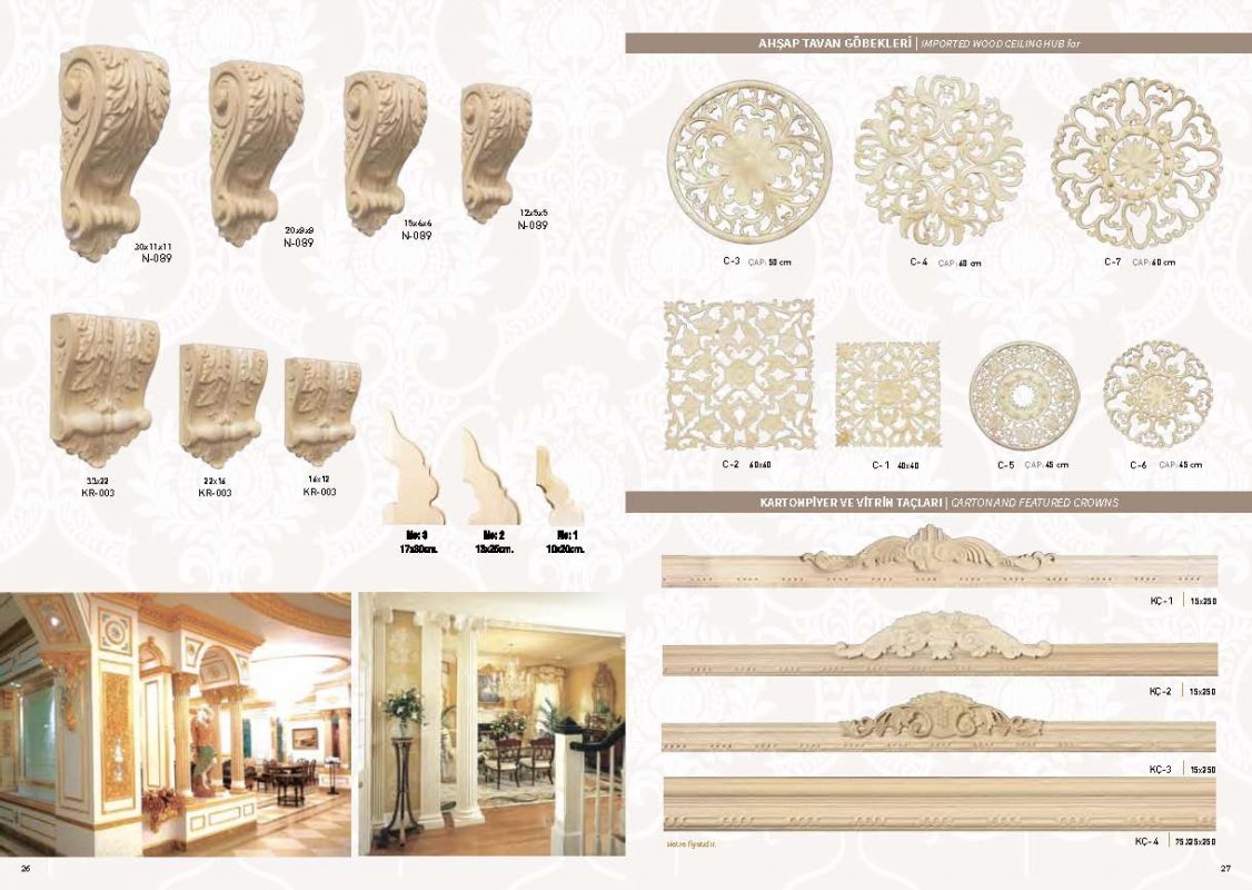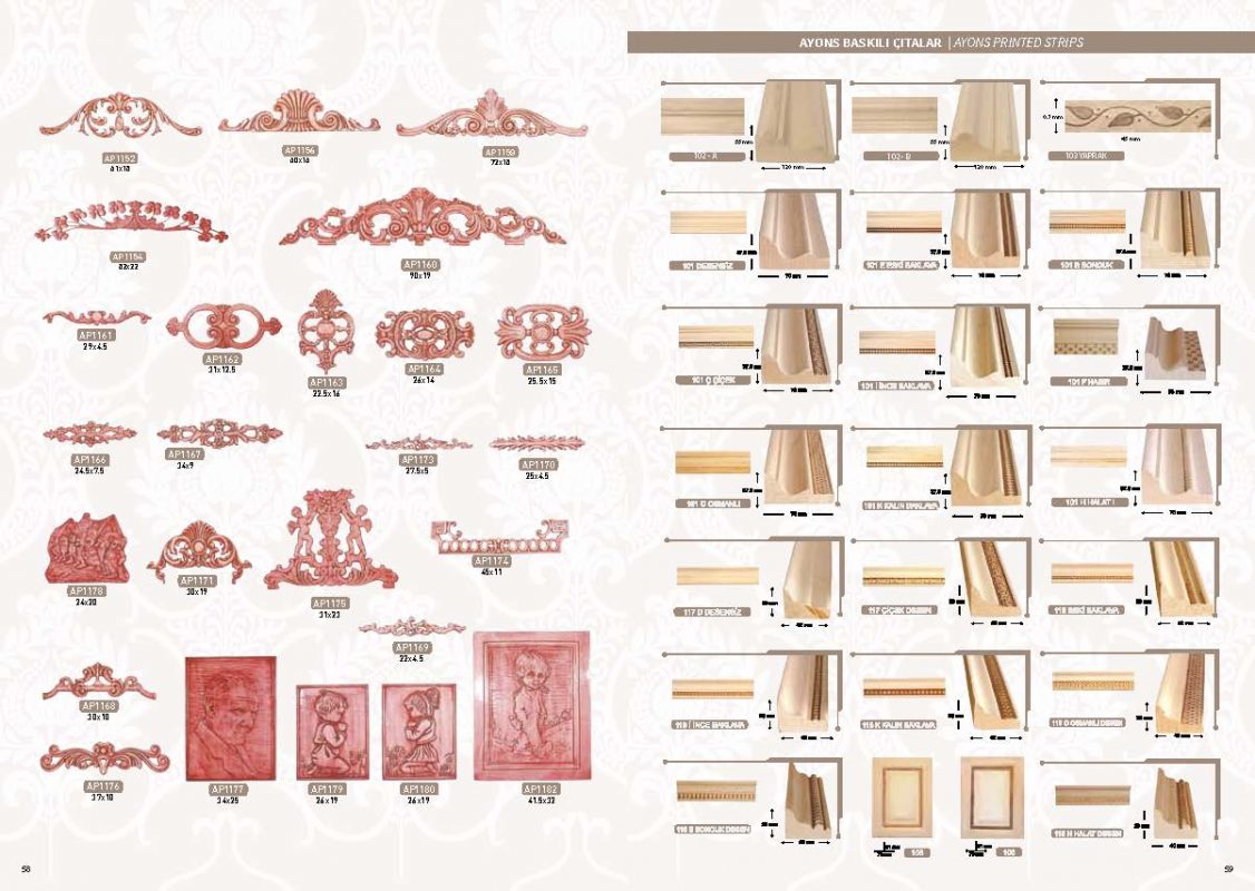 Mobilya kapı ve iç mekan dekorasyonlarında kullanabileceğiniz ahşap oyma torna ve profil çıta gruplarıyla yüksek kalite estetik tasarımlarıyla dikkat çeken ürünlerimizle özel tasarım çizim ve projelerinizde usta ve malzeme desteğimizle her zaman hizmetinizdeyiz